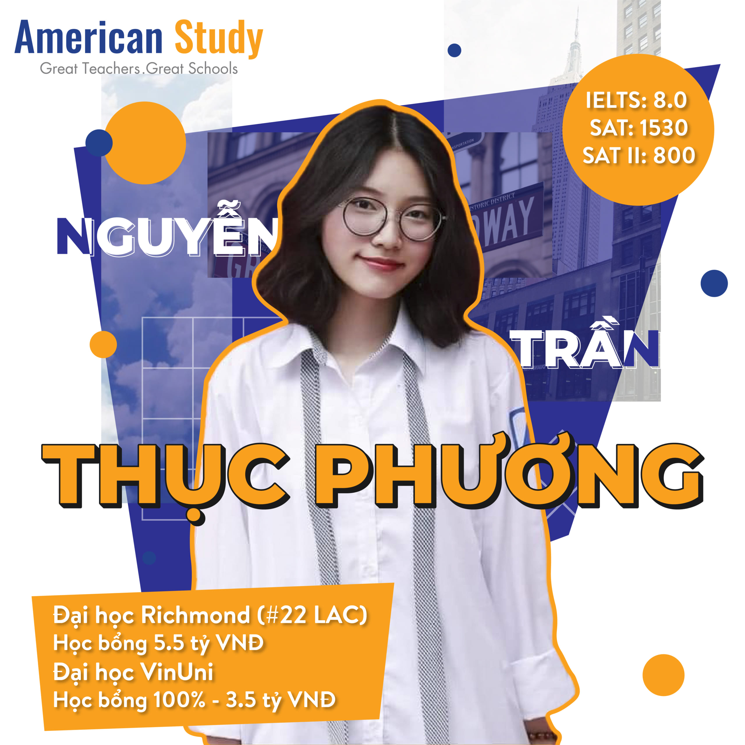 Khác với đa số bạn bè tại ngôi trường THPT chuyên Hà Nội – Amsterdam, cô bạn Nguyễn Trần Thục Phương chuẩn bị cho hồ sơ du học khá muộn. Đến cuối kì 1 năm lớp 11, Phương mới để ý đến bộ hồ sơ du học Mỹ trong khi thời gian lý tưởng nhất để chuẩn bị là ngay từ lớp 10. Xuất phát điểm ở phía sau các bạn không khiến Phương cảm thấy tự ti mà trái lại đã tiếp thêm sức bật mạnh mẽ cho cô nàng. Thành công cuối cùng cũng đã đến với Phương khi em liên tiếp nhận được học bổng 5.4 tỷ cho 4 năm học từ trường ĐH Richmond và học bổng 100% từ VINUNI.